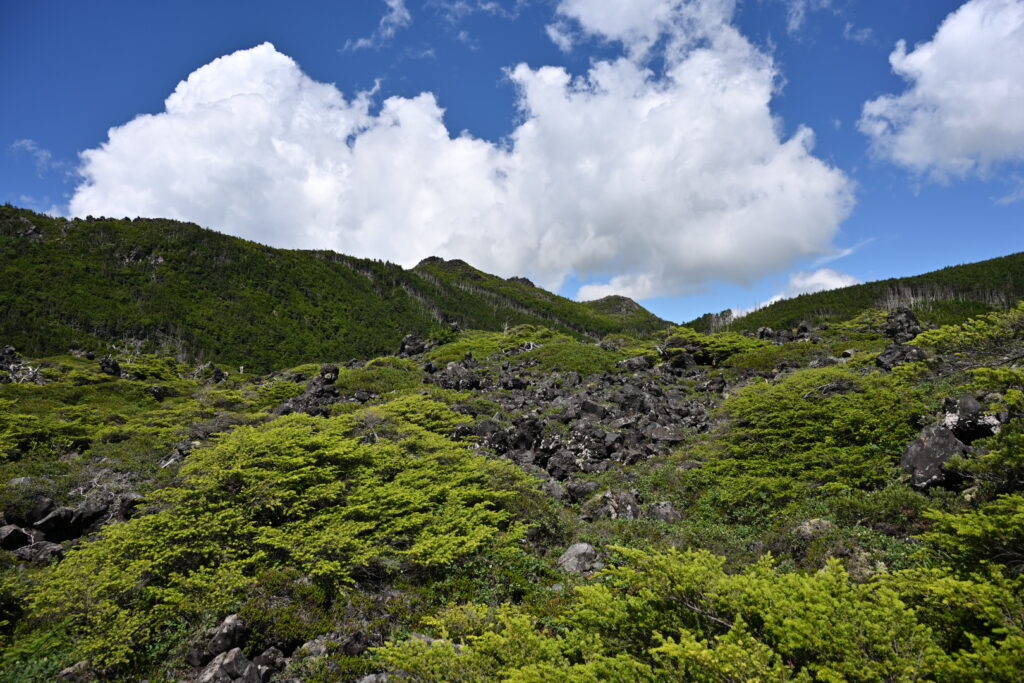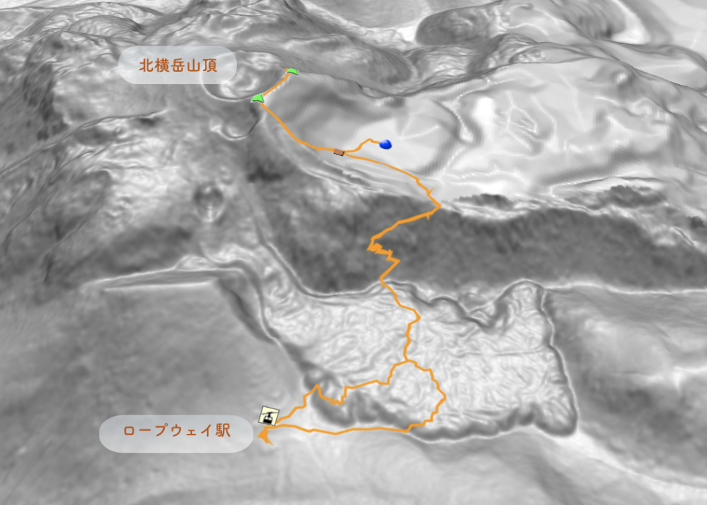 地理院地図の傾斜量図を確認すると、この岩稜帯は北横岳から流れて出てきたことがよくわかる。