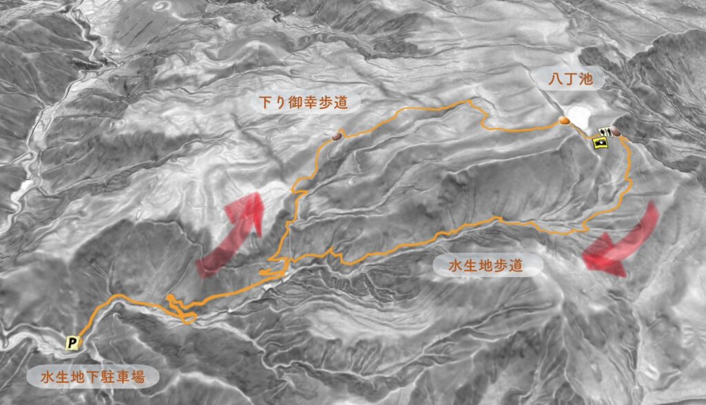 今回は、水生地下駐車場から、「下り御幸歩道」を登りに使って、「水生地歩道」を下山に使う周回ルート。