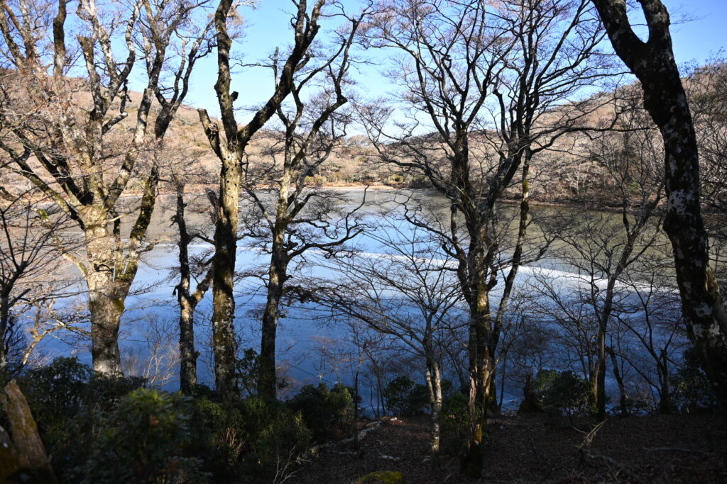 木々の隙間から、ついに一部が結氷した八丁池が見えた。