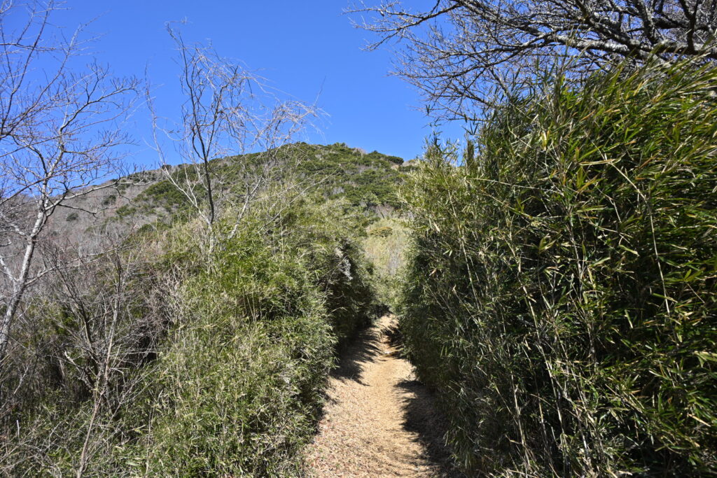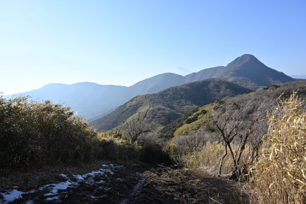 この箱根竹に囲まれた登山道も、陽の光が届かず凍っていてけっこう滑った。