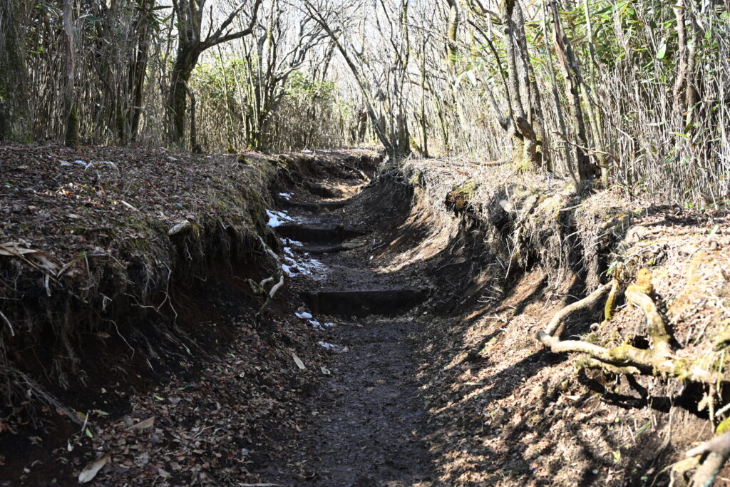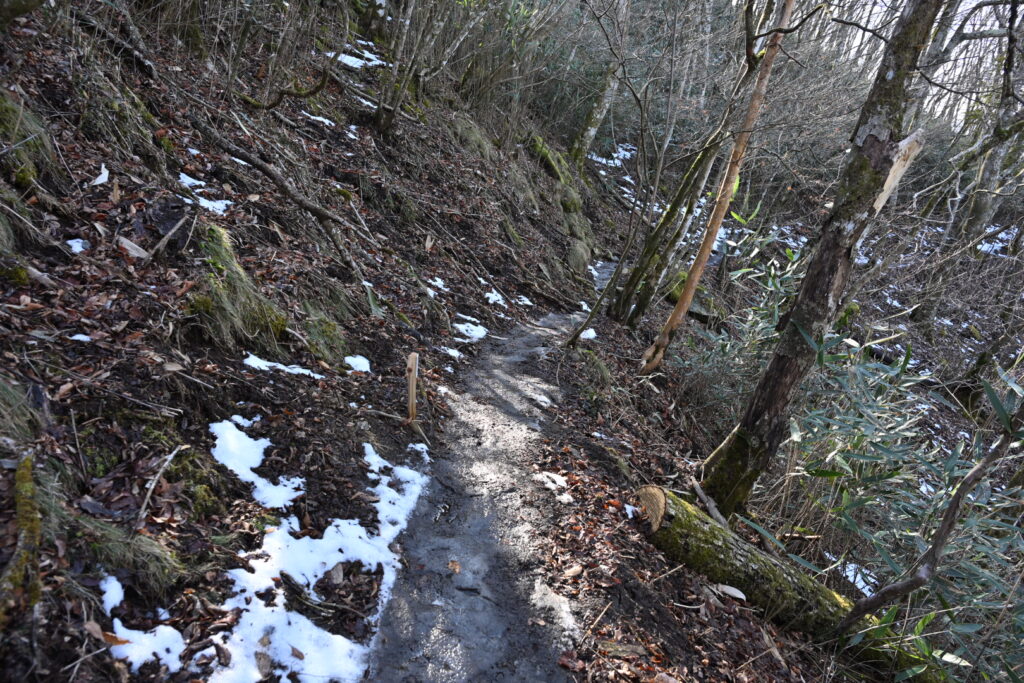 この辺りから北側斜面をトラバースするルートになり、所々凍結した路面も現れ、トレッキングポールを利用して慎重に歩いた。