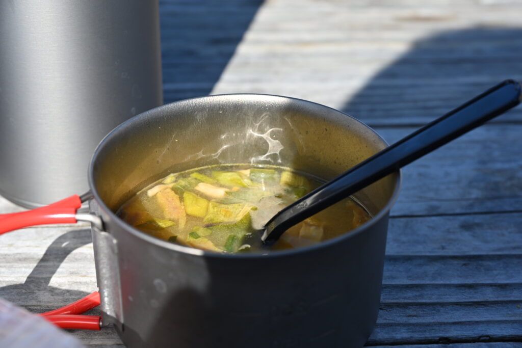 新丸ビルの地下で購入した、山吹味噌の即席味噌汁とおにぎりもいただく。
