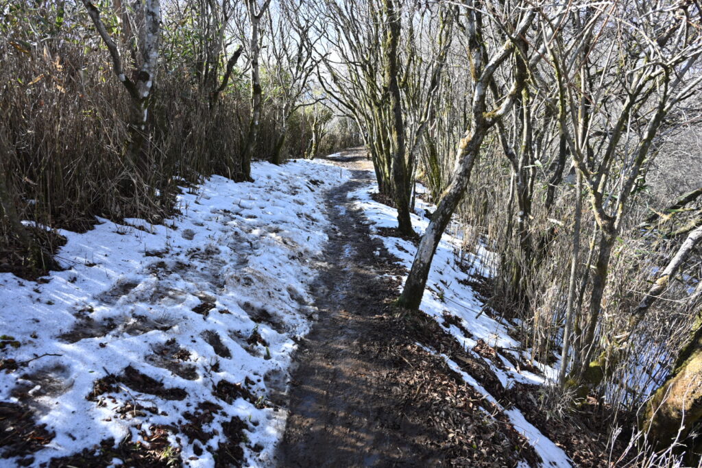 この辺りから、日陰では残雪とドロドロになった登山道が現れた。