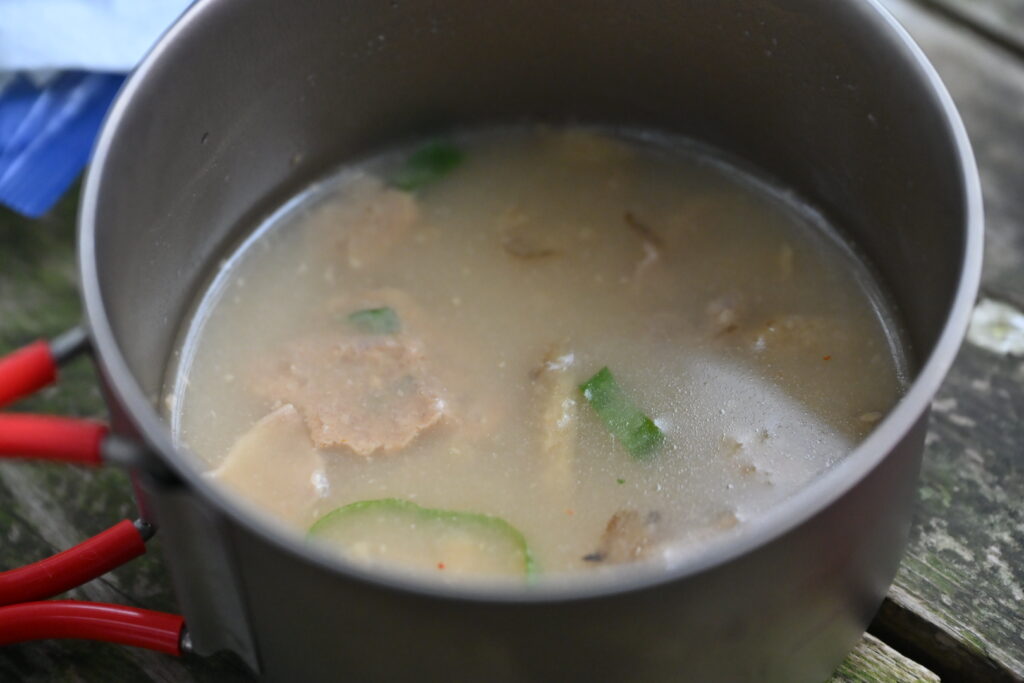ここのベンチで、ヤビツ峠で購入したちまきと、アコメヤの豚汁をいただく。